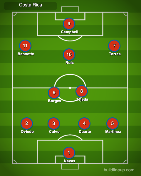 In the most recent run of games Costa Rica has been often playing with a 4-4-2. They like to be a well-positioned team that defend as a unit. While they will allow the opponent take the initiative - Costa Rica press up high against teams that like to play out of the back, they can look for chances in the counter, and are also capable of building up their chances. The speed of Joel Campbell up top and the precision from Borges and Ruiz are the best weapons the team has.