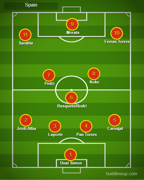 Up top Spain lately has opted for the winger duo of Pablo Sarabia and Ferran Torres, but Mikel Oyarzabal could be another good option. The projected stiker is once again Alvaro Morata, but don't be surprised if Luis Enrique decides to put Marco Asensio as a false 9.