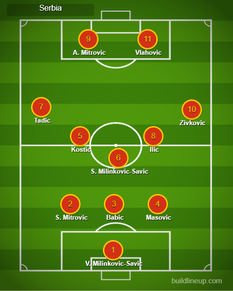 Team's philosophy: Throughout the tournament you will see a lot teams supposedly playing with only three at the back, but in reality their wingbacks are defenders, but in this case with Serbia that is really how they've played in their most recent games - A 3-5-2, with this setup the team has a lot of people in midfield to control the flow of the game, they keep 3 center backs to avoid being caught on the counter, and two strikers to ensure opposing defenses have to keep their focus.