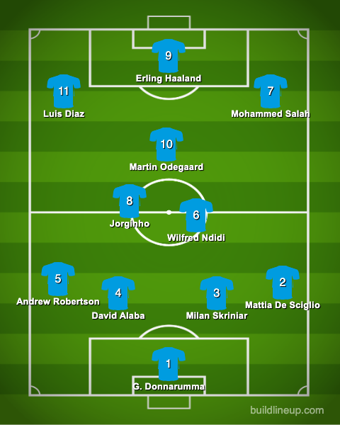 I love the front three with Luis Diaz, Mohamed Salah flanking Erling Haaland - if this team was on the field this could very well be a top three, top five attacking three in the tournament.